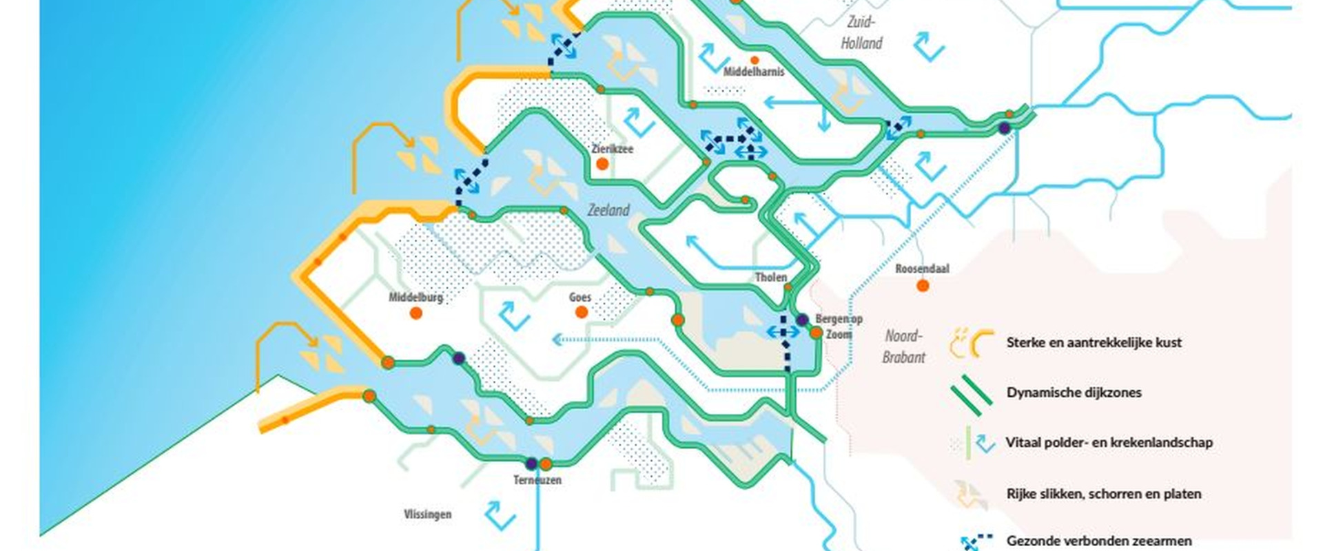 In het voorwoord benadrukken de minister van IenW, de voorzitter van het Gebiedsoverleg Peter Smit en de vicevoorzitter van de Adviesgroep Zuidwestelijke Delta Rian de Feijter de urgentie om samen te werken aan een klimaatbestendige Zuidwestelijke Delta: ‘Het besef groeit dat we elkaar hard nodig hebben voor een passend antwoord op de uitdagingen van de klimaatverandering en de gevolgen ervan voor de waterveiligheid, de zoetwaterbeschikbaarheid, de ecologie, het landschap en de regionale economie.’